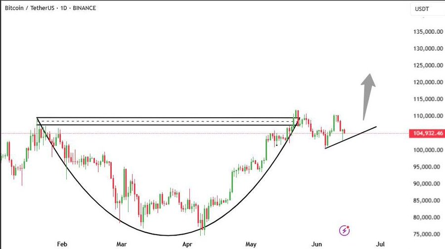 Bitcoin is consolidating at nearly $106,000 following the formation of a bullish cup and handle pattern. Market analysts have found a neckline at the price of 111000, and a breakout may drive the prices up to the price of 114000. Previous experience demonstrates that such similar trends can lead to substantial price rallies.