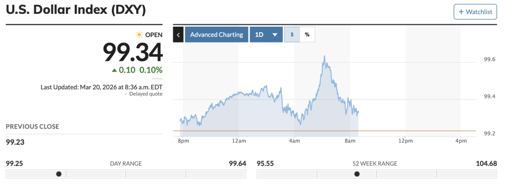 The macro backdrop is not helping. DXY is sitting near 99.32 with the Fed ruling out rate cuts until inflation cooperates.