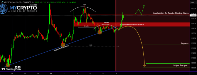 MyCryptoParadise outlined that the best way to play this analysis is to wait for confirmation. With the bearish thesis, they explain that it is best to wait for the XRP price to see a “proper pullback” before they enter the market. This would increase the risk-to-reward ratio after the trend direction has been confirmed.